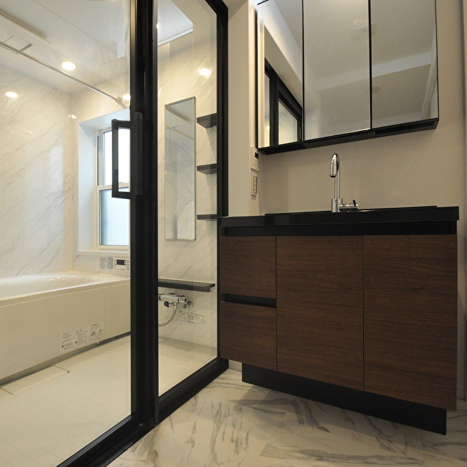 シンプルな色調で仕上げたホテルライクな洗面室と浴室。 |
