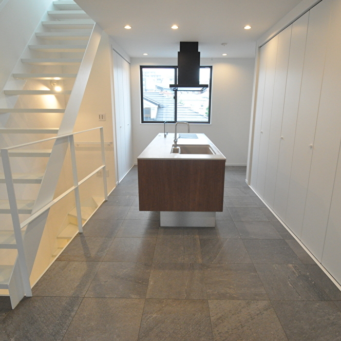 アイランド型キッチン。圧迫感が少なく、開放的な空間になっています。キッチン背面には大容量の収納を設けています。 |