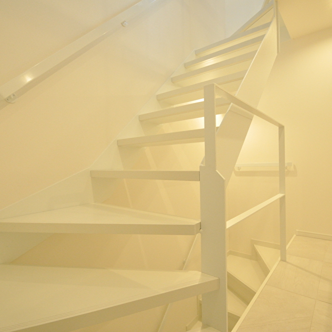 屋上まで続く階段は、スケルトン階段を採用。上階から差し込む自然光のお陰で明るい空間に。 |