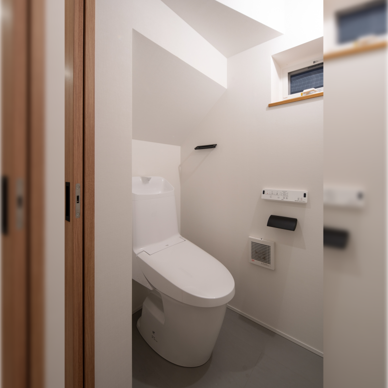 高身長のお施主様の使い勝手を考え、階段下のトイレの床高を下げました。 |