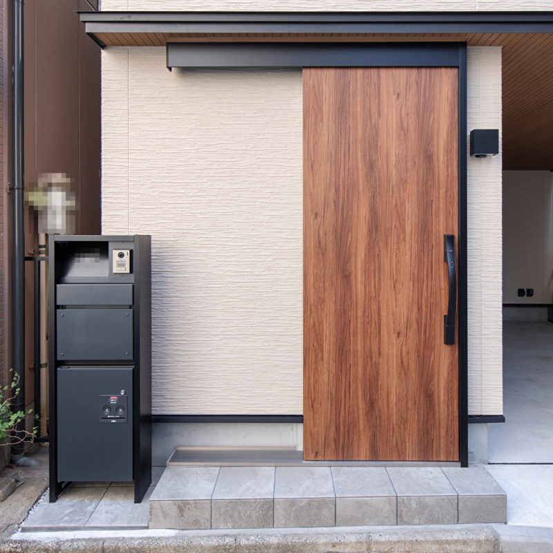 すっきりとした印象の玄関。 限られたスペースにも宅配ボックスを設けました。 |