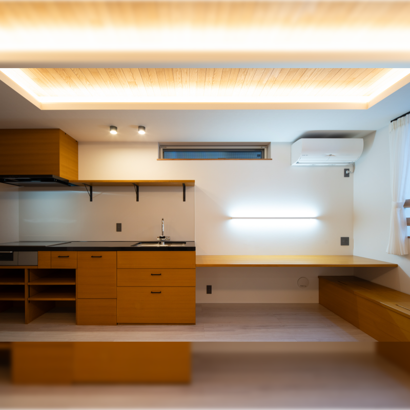 落ち着きのある木素材の造作キッチン。 キッチン隣にはパントリーを設け、収納も確保しました。 LDKで色調を揃えて、すっきりした空間に仕上げました。 |