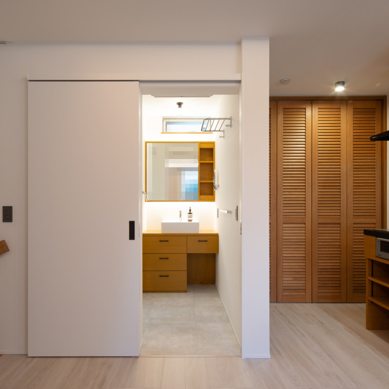 リビングダイニングに直結する洗面室。 キッチンと同じ素材の造作洗面化粧台。 空間に統一感が生まれます。 |