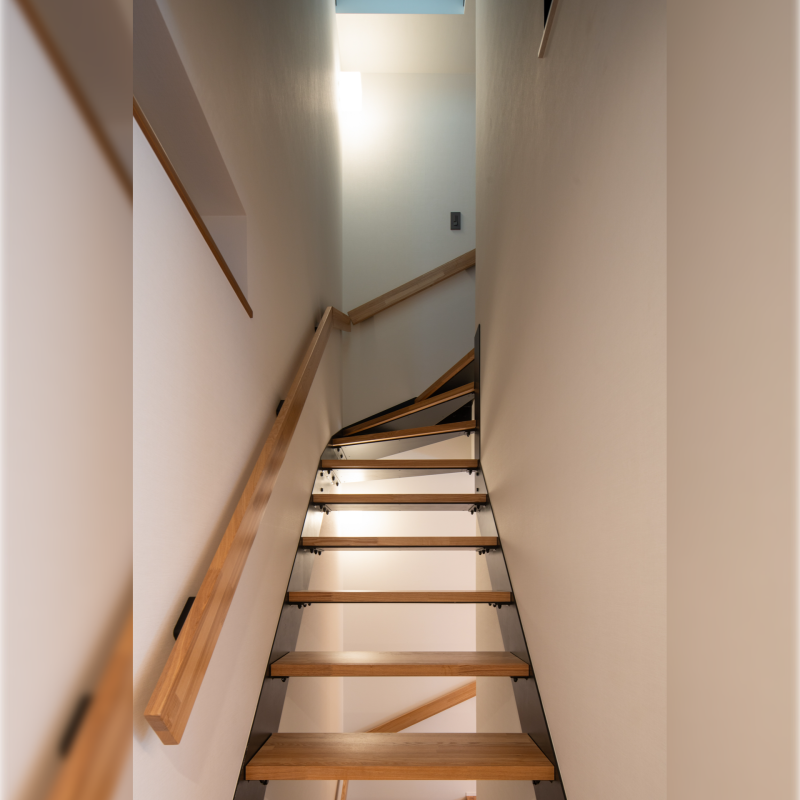 屋上からの光を十分に活用するため、階段はスケルトンにしました。 |